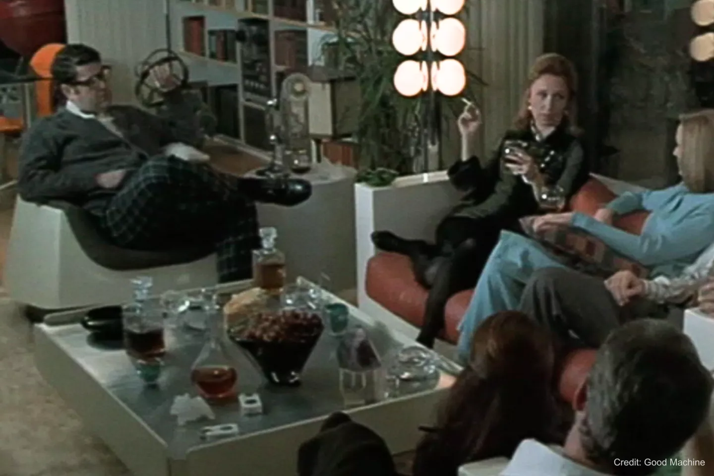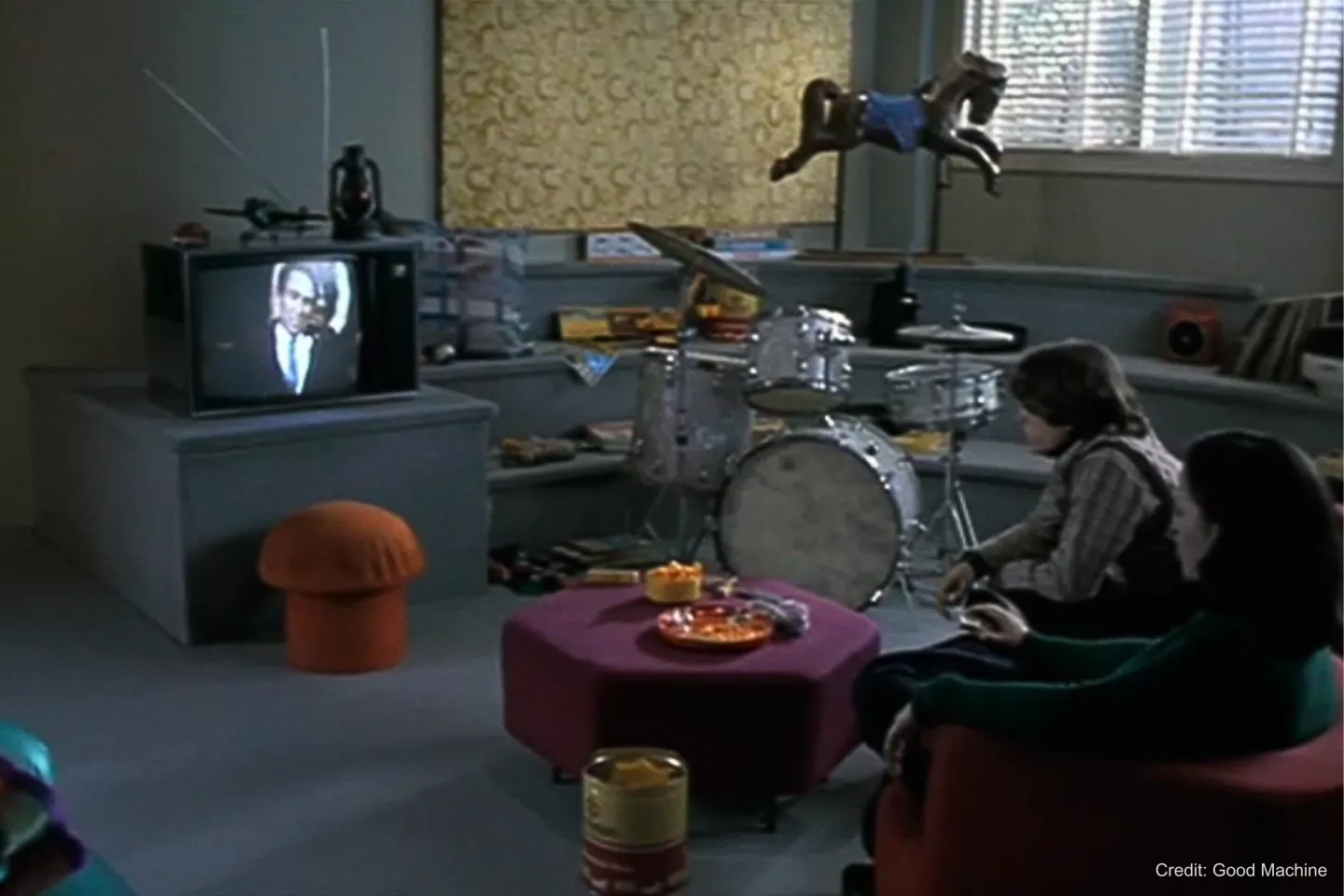 《The Ice Storm》的場佈充滿了 1970 時代特徵,包括色彩繽紛的家具、花卉圖案壁紙和地毯,這些元素共同營造出溫馨但壓抑的家庭空間。復古家飾及燈飾配件 進一步強化了時代背景。色彩運用上,多採用大地色系的溫暖色調,反映出 1970 年代的流行,同時也強調了 角色間的情感張力和壓抑氛圍。
