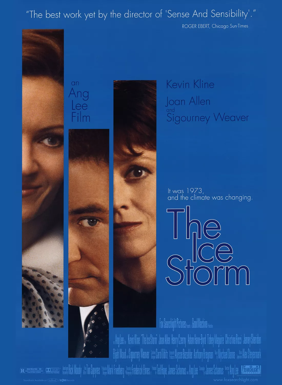《The Ice Storm》(《冰風暴》)這部電影由李安執導,改編自Rick Moody的同名小說,背景設定在1973年的康乃狄克州。影片聚焦兩個家庭在冰風暴期間面臨的情感危機,探討婚姻不忠、家庭破裂和青春期困惑等主題。演員陣容包括凱文·克萊恩、瓊·艾倫、克莉絲汀·鄧斯特和托比·馬奎爾,這部電影因其細膩的敘事和深刻的情感刻畫獲得了高度評價,是一部揭示人性複雜性的佳作。