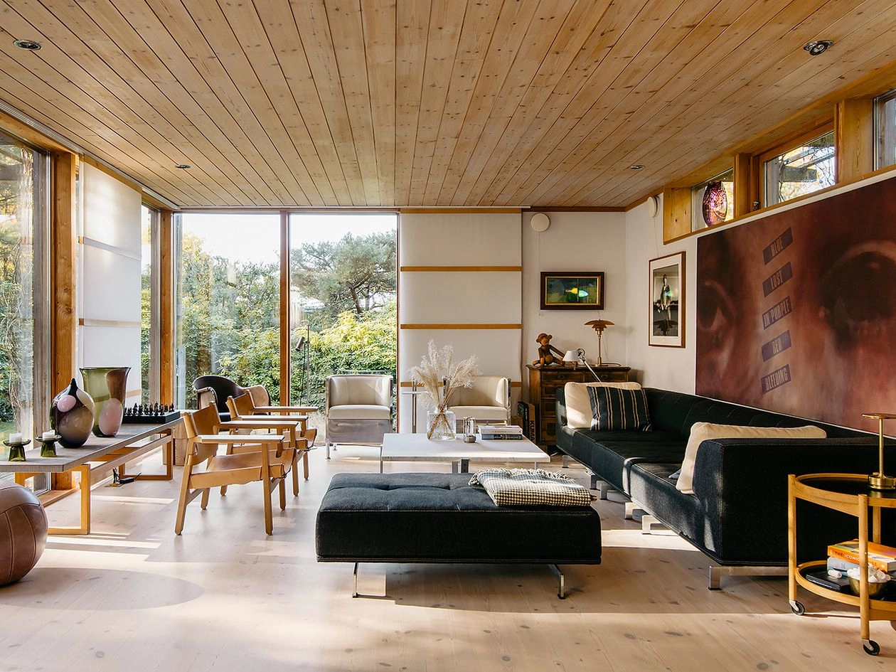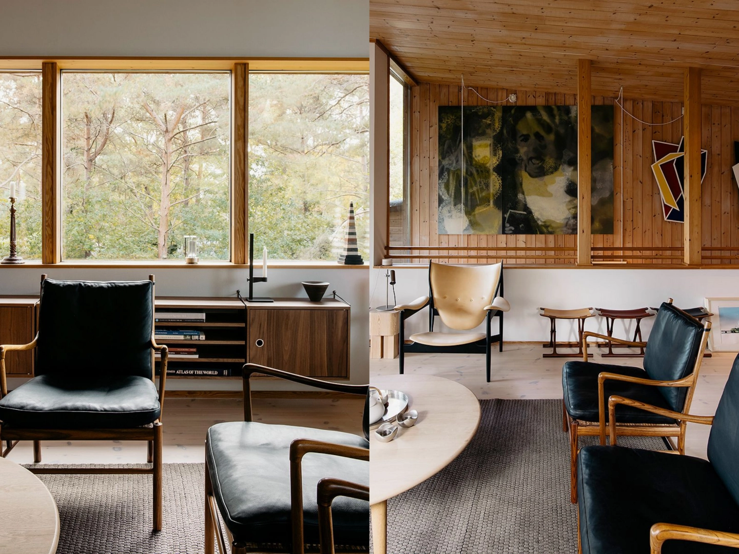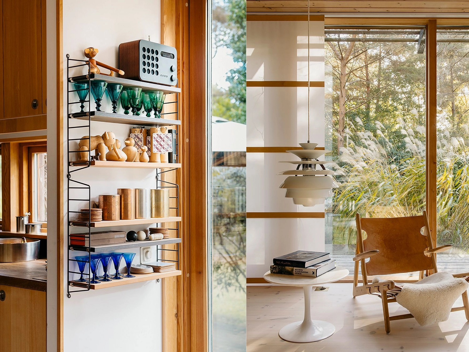 這棟狹長建築像是一艘靜靜泊在松林中的船,外牆以西伯利亞落葉松包覆,內部則由大片落地窗引入海岸的光與風,屋子隨著地勢蜿蜒延展,沒有過度造作的轉折,卻每一處都照顧到了自然的節奏與家庭的生活走進屋內,像是一場設計迷的尋寶遊戲——你會發現 Hans Wegner 的椅子、PH 雪球燈、Mogensen 的經典作品,還有幾乎每個角落都在使用的 String 層架,不只是客廳、書房、浴室、陽台,就連最不起眼的牆面,也安裝著鍍鋅材質的 String 系統,任憑濕氣與海風吹拂,仍穩定如初。