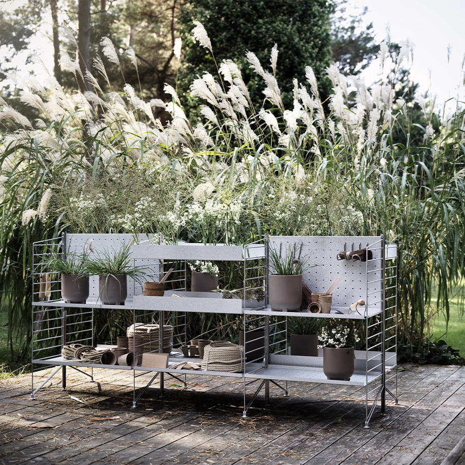 這款三組套大型組合經過優化設計,在置物架的前後兩側都安裝了層板。高擋邊和低擋邊的鍍鋅金屬層板的混合搭配賦予置物架以個性。鍍鋅材料會隨著時間的推移而變化,泛出美麗的銅綠色光澤。