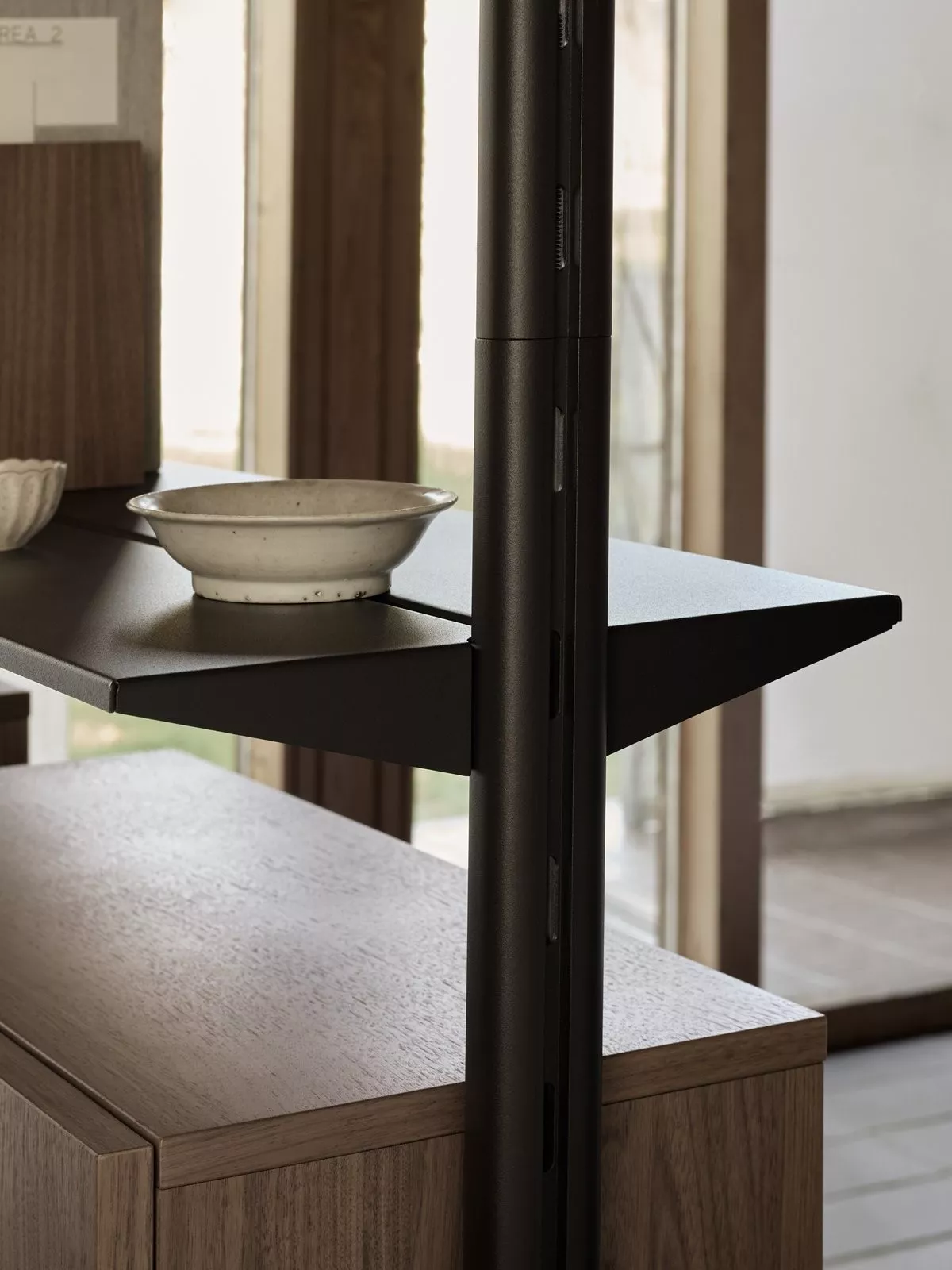 支撐桿採用擠壓鋁製成,有黑灰色或白色可選。層架為壓紋鋼板,並配有加強邊緣。櫃體與收納配件則有胡桃木或白橡木材質。