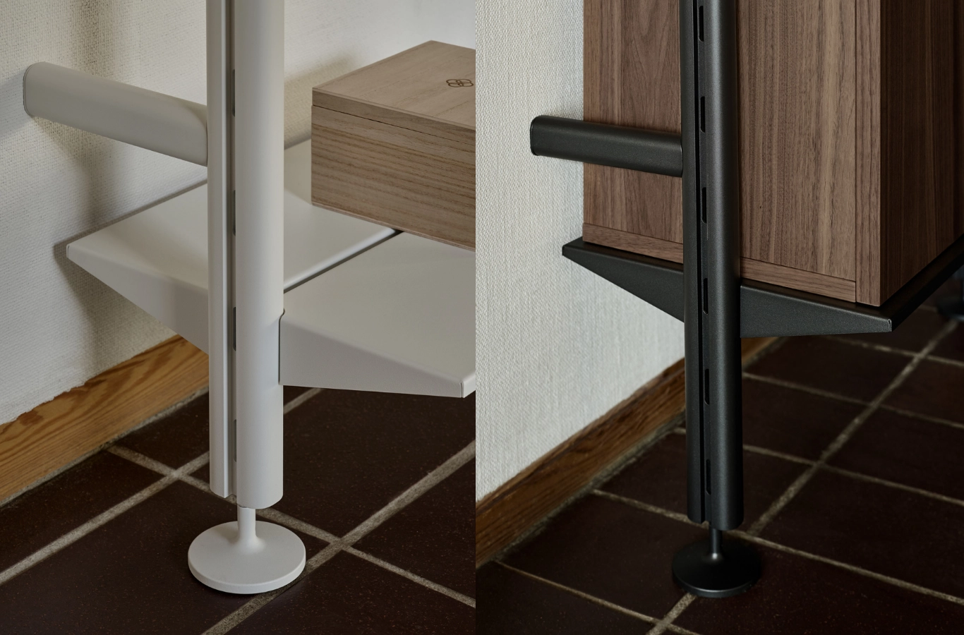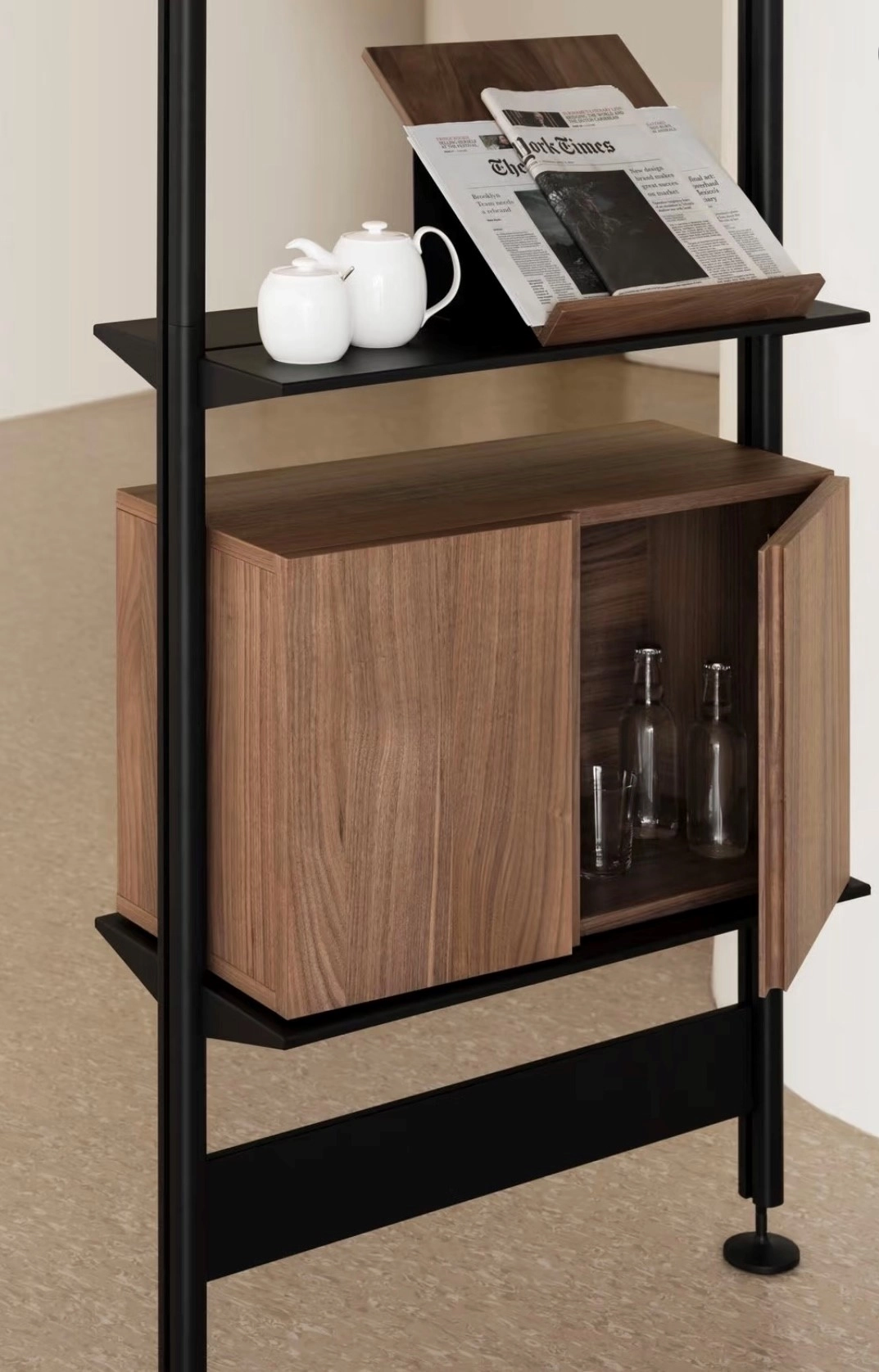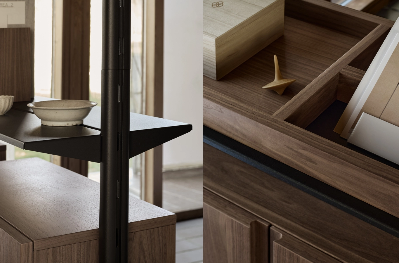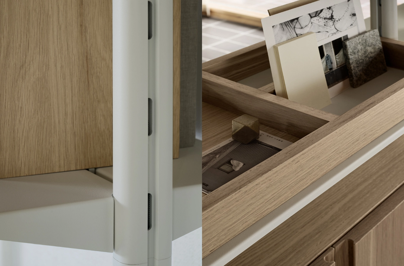 主結構立柱採擠壓成型鋁合金(extruded aluminum) 製作,表面以高耐磨粉體塗層處理,提供霧黑灰與霧白兩種色系選擇。 層板為壓紋烤漆鋼板,邊緣加強折彎以提升結構剛性與層次感,櫃體與收納配件則使用胡桃木或白橡木實木貼皮板材,以天然木紋與金屬結構形成柔和對比,在工業精度與生活溫度之間取得細緻平衡。