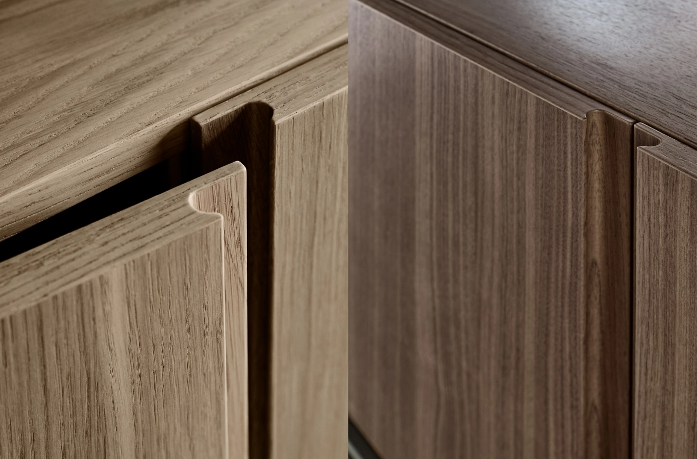 Oak & Walnut veneer detail. Crafted with precision and quiet warmth.