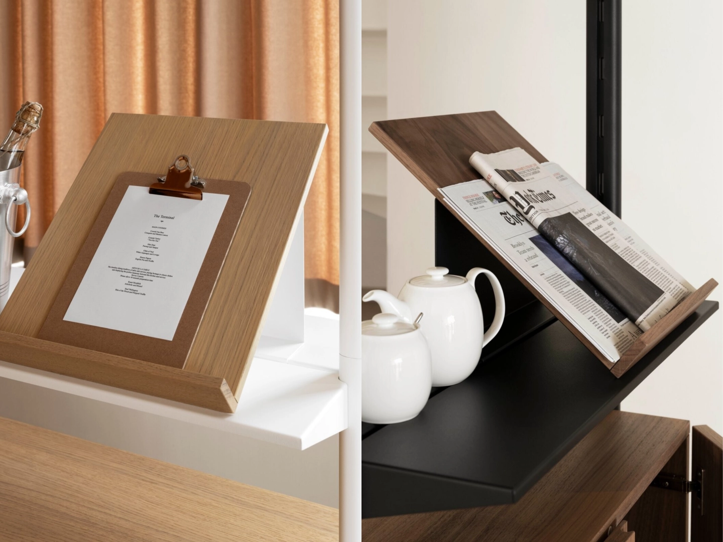 系統具備 70 公分與 90 公分 兩種單位寬度,可依空間比例靈活排列。另提供三款配件可選—— 書擋、置物分隔盤、雜誌架,滿足不同情境下的展示與收納需求。
